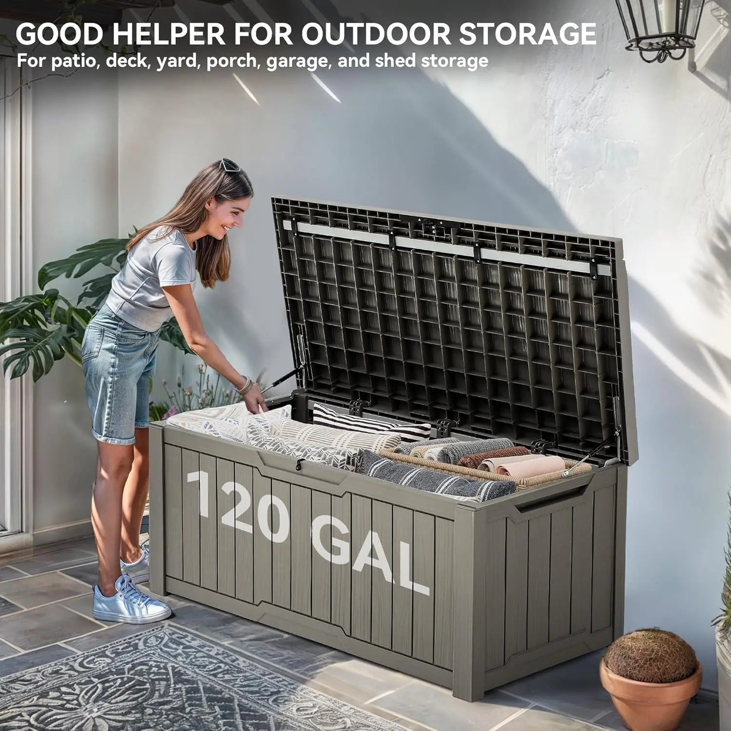 - Ample storage: Dimensions 55.9'' x 26.6'' x 23.6'' with a 120-gallon capacity to neatly store your cushions, garden tools, and pool accessories.